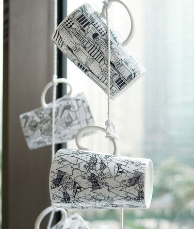 涂鴉圖案風(fēng)格的瓷質(zhì)水杯,主題風(fēng)格鮮明,年輕的瓷器控超級喜愛。一次購買多個圖案的杯子,用結(jié)實(shí)的尼龍繩把杯子一個個地穿起來,綁牢固,懸掛在窗前,就變成一串風(fēng)格獨(dú)具的大號風(fēng)鈴,個性又帶有畫家風(fēng)格。