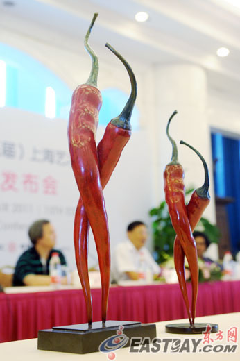 據(jù)悉,由新加坡女藝術(shù)家?guī)飕旣悾↘umari Nahappan)創(chuàng)作的大型雕塑《幸福探戈》,被確定為今年藝博會(huì)的主題雕塑作品,并將被放置在舉辦場(chǎng)館世貿(mào)商城門口最顯著的位置!缎腋L礁辍犯哌_(dá)六米,以兩只體態(tài)修長(zhǎng)的紅辣椒為探戈舞主角,神態(tài)生動(dòng),舞步狂放,凝視間您的耳畔與雙眸仿佛能夠鮮活地聽到并看到節(jié)奏明快,華麗高雅、變化無窮的探戈在熱烈舞動(dòng)。屆時(shí)廣大觀眾也將在藝博會(huì)開幕之時(shí)欣賞到這件作品。