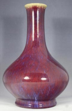 瓷器在窯內(nèi)燒成時,由于窯內(nèi)含有多種成色元素,經(jīng)氧化或還原作用,出窯后,釉面色彩斑斕,呈現(xiàn)出意想不到的效果。它本出偶然,由于呈色特別,又不知其原理,只知經(jīng)窯中焙燒變化而得,所以自古稱為“窯變”。清代以前景德鎮(zhèn)的窯變釉瓷都不是認為燒制的,偶爾燒制的窯變釉瓷也未流傳下來,這與當時人們認為窯變釉瓷是“怪胎”,出現(xiàn)窯變即預示不祥,多將其搗毀有關。到了清代,景德鎮(zhèn)的窯變釉才開始作為著名色相而專門生產(chǎn),雖然也入火使釉流淌,顏色變化任其自然,并非有意預定為某種釉色,但已經(jīng)能夠人為地配制釉料、控制火候,可以說基本上掌握了窯變的規(guī)律,成功地燒制出大批窯變釉瓷。