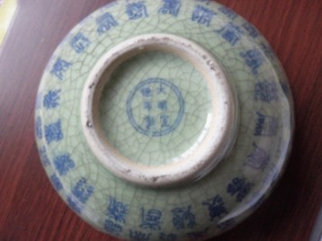 宣德官窯器載款的器底釉面,白中閃青,晶瑩滋潤并有橘皮紋。宣德官窯款,一般用進(jìn)口的蘇麻離青料,或在進(jìn)口料中適當(dāng)摻入一些國產(chǎn)青料寫就。呈色多為濃重的純藍(lán),深邃處有鐵的結(jié)晶斑。但款銘色澤濃度不一,并痛覆蓋款銘的透明白釉緊密結(jié)合,使得筆畫的四周好像上了一層白霧。用八倍以上的放大鏡在強(qiáng)光下審視,款色多霧暗而下沉,器身和口內(nèi)、足內(nèi)釉薄處,閃有明顯的牙黃色;濃釉處微閃淡青色。