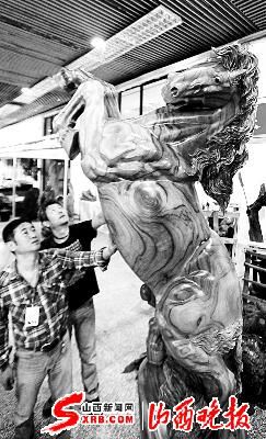 此次博覽會(huì)由太原市國(guó)際貿(mào)易促進(jìn)委員會(huì)、太原市會(huì)展工作辦公室聯(lián)合主辦。進(jìn)入展會(huì)現(xiàn)場(chǎng),珠寶首飾、珍珠瑪瑙、根雕岫玉、紅木家具、書畫奇石、沉香核雕、紫砂陶瓷、茶葉茶具,上百種收藏品在各自展廳展出。在B11展廳,2.6米長(zhǎng),1米寬的駿馬木雕受到眾多參觀者圍觀。“30多種木雕,專門從福建運(yùn)到太原來。”該展位負(fù)責(zé)人趙君介紹,駿馬用料為香樟木,售價(jià)在16萬(wàn)左右。
