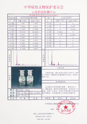 近日,市民金先生將兩年前在北京某拍賣會(huì)上拍到的一對(duì)粉彩撣瓶,送中華疑似文物甄別保護(hù)委員會(huì)云南科技檢測(cè)中心鑒定。自從北京回昆后,一些專家認(rèn)為其撣瓶是光緒瓷,一些專家認(rèn)為是民國(guó)仿。奇怪的是,還經(jīng)常有陌生電話打來(lái),提出想要低價(jià)收購(gòu)。感覺事有蹊蹺的金先生,希望借助科學(xué)鑒定明了真相。