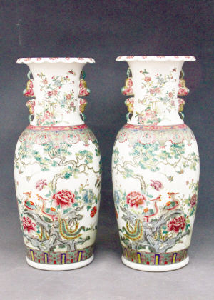 撣瓶也稱嫁妝瓶,其最初的用途就是供大戶人家往里邊插放雞毛撣子。后來(lái),逐漸成為晚清到民國(guó)時(shí)期的居室陳設(shè)品,那時(shí)候撣瓶?jī)r(jià)值是非常高的。這對(duì)粉彩五倫圖雙獅耳撣瓶,器型碩大已非常罕見,再加上工藝精湛、品相完美、寓意吉祥,無(wú)疑成為當(dāng)前收藏界熱捧的瓷器品種。