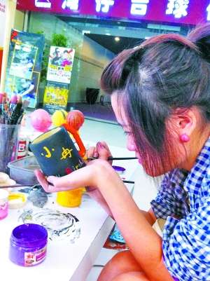 在農(nóng)業(yè)路寶龍廣場(chǎng)內(nèi)的一家陶吧里,琳瑯滿目的陶藝DIY手工藝品擺在櫥窗里,完全沒有從機(jī)械模出來的單調(diào),手劃的色條,也沒有了機(jī)印上去的乏味,好看、有趣得讓人愛不釋手。這些獨(dú)特好看的作品像一雙雙搖擺的手,無時(shí)無刻不在吸引著你的注意。再加上店內(nèi)的輕音樂,一股雅致的氣息油然而生。