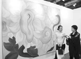 發(fā)現(xiàn)新銳,是許多收藏家和畫廊業(yè)者觀看藝博會的一大目的。吳訓(xùn)木是新近被滬上畫廊發(fā)現(xiàn)并首次在藝博會上推出的傳奇性畫家。他人生道路大起大落,最后放棄了財富羈絆,選擇了流浪和繪畫的自由?此某橄螽,觀眾感嘆他怎么會有如此充沛的激情和體力。他在巨幅畫布上揮灑五彩,如狂風(fēng)暴雨。不少路過的行家異口同聲道:“中國的波洛克(美國抽象表現(xiàn)主義先驅(qū))!”