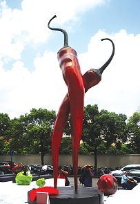 本屆展會的另一大亮點是由新加坡女藝術(shù)家?guī)飕旣悇?chuàng)作的大型雕塑《幸福探戈》,今年被確定為藝博會的主題雕塑作品,并被放置在舉辦場館世貿(mào)商城門口最顯著的位置!缎腋L礁辍犯哌_六米,以兩只體態(tài)修長的紅辣椒為探戈舞的主角,神態(tài)生動,舞步狂放,使人的耳畔與雙眸仿佛能夠鮮活地聽到并看到節(jié)奏明快、華麗高雅、變化無窮的探戈在熱烈舞動。