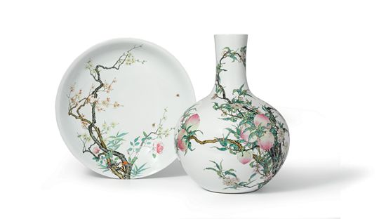 “玫茵堂珍藏”呈現(xiàn)達(dá)40件明、清兩朝珍品,最受人矚目的為來(lái)自15世紀(jì)初的大型青花果紋飾瓶及18世紀(jì)的粉彩桃紋件天球瓶。此外,此次拍賣(mài)還匯集了兩個(gè)香港私人珍藏——懷海堂珍藏及一批銅胎畫(huà)琺瑯器收藏。