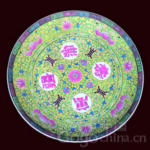 乾隆朝除了白地繪粉彩外,還有色地粉彩或色地開(kāi)光中繪粉彩等品種。乾隆朝粉彩的創(chuàng)新品種是在黃、綠、紅、粉、藍(lán)等色地上用極細(xì)的工具軋出纏枝忍冬或纏枝蔓草等延綿不斷的紋飾,且多和開(kāi)光一起使用,人稱軋道開(kāi)光。這一工藝的出現(xiàn),將粉彩推上了更加富麗繁縟的頂峰,一直延續(xù)到民國(guó)。另外,乾隆朝還有部分在粉彩瓷器的內(nèi)壁及底足內(nèi)施綠彩,俗稱"綠里綠底",一直流行到清末、民國(guó)。乾隆朝的"綠里綠底"極淺淡,迎光側(cè)看釉面有極細(xì)小的皺紋,像微風(fēng)吹過(guò)平靜的湖面而形成的細(xì)波。綠彩附著在白釉上非常緊密,幾乎沒(méi)有爆釉現(xiàn)象。
