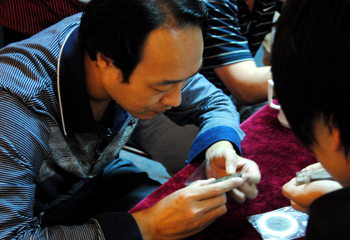 活動現(xiàn)場非;鸨皝龛b定的物品囊括了書畫、玉石、日本刀、青花瓷、紫砂壺、各種錢幣等等,包羅門類非常廣泛,品種眾多。鑒定會上,前來鑒定的朋友希望聽到專家鑒定真?zhèn)蔚囊罁?jù),現(xiàn)場的專家雖然鑒定作品數(shù)量眾多,很是勞累了,但依然細心耐心的一一解答藏友提出的問題,還對藏友今后的收藏方向進行了指導。