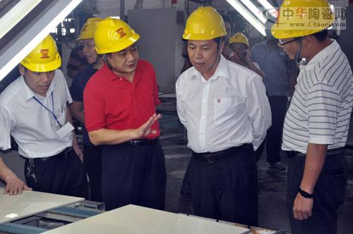 嘉俊陶瓷副董事長(zhǎng)陳耀強(qiáng)(右1)陪同恩平市委書記李灼冰(左1)一行參觀調(diào)研