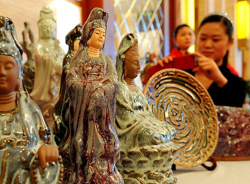 2月15日,一名參觀者在拍攝鄭商瓷作品。記者從中國(guó)貿(mào)促會(huì)獲悉,由河南省貿(mào)促會(huì)和鄭州市組織推薦的鄭商瓷作為我國(guó)陶瓷藝術(shù)類的唯一代表參加2012年韓國(guó)麗水世博會(huì),并成為中國(guó)館全球合作伙伴。鄭商瓷由鄭州大學(xué)歷史學(xué)院教授、中國(guó)民協(xié)陶瓷專業(yè)委員會(huì)主任閻夫立在繼承商代青瓷制作工藝和吸收“五大名瓷”精華的基礎(chǔ)上發(fā)明的綠色環(huán)保新瓷種,其名取“鄭州”“商都”“瓷之國(guó)粹”的首字組成,曾作為鄭州文化品牌參加2010年上海世博會(huì)。新華社記者 李安 攝