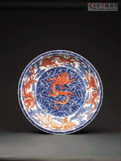 而這件“青花紅彩波濤云龍紋大盤”的龍紋組合獨(dú)具特色。全器以釉下青花及釉上紅彩裝飾,盤心繪一龍于海水中戲珠,海水以青花描畫,龍紋戲珠則飾以橘紅彩。內(nèi)口沿青濤一周,內(nèi)外盤壁各畫二對(duì)波濤中追逐的紅彩龍紋,龍紋均以深淺二色橘紅彩渲染描畫,橘彩明麗;卷云及海水紋則以青花鉤繪,釉色鮮明,全器胎骨勻稱,潔白細(xì)膩,盤底青花書(shū)「大清雍正年制」二行六字楷款,外加雙青圈。