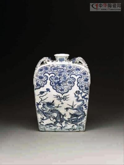 比如,這件“青花雙龍戲珠紋扁壺”傳世不多,彌足珍貴。這把扁壺唇口,短頸,器身呈扁長(zhǎng)方腹、上微寬似馬蹄形,肩兩側(cè)各貼有螭龍紋雙系,長(zhǎng)方足。器身兩面上方均繪如意云頭紋,紋內(nèi)畫穿花雙鳳紋,花卉一為菊花,一為石榴花,雙鳳姿態(tài)均不相同;器身下半部各畫雙龍戲珠紋,上下加飾云紋及波濤海水紋;壺兩側(cè)飾如意云紋及纏枝蓮。青花釉色濃艷明麗,多處帶鐵褐疵斑。胎體略重,質(zhì)堅(jiān)細(xì)膩,長(zhǎng)方形底足內(nèi)凹無(wú)釉,但多處沾黏白釉,白釉泛青,底留刮修遺痕,胎釉間呈淺橘色。扁壺紋飾為典型元代風(fēng)格,元代常見(jiàn)使用的如意云頭紋,來(lái)自金、元袍服上的披肩織品等裝飾,穿花雙鳳紋亦借鑒于宋代織品,元代青花將各種流行紋飾匯聚之表現(xiàn),造成青花紋飾的獨(dú)特風(fēng)格,風(fēng)靡一世,至今仍魅力不減。
