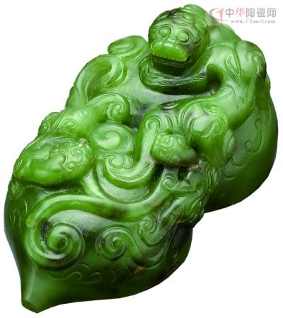 5月17日,邦瀚斯在倫敦新邦德街舉行了“中國陶瓷及工藝品拍賣”,一件清乾隆翠玉雕螭龍紋鈕“三希堂”篆字陽文葫蘆形印,估價(jià)逾千萬元,最終成交價(jià)3400萬元,榮登本場冠軍;另一件18世紀(jì)青玉雕山水人物大山子,為李鴻章贈(zèng)予恭親王奕欣的禮物,后輾轉(zhuǎn)日本、美國,1963年又于倫敦拍賣,成為英國重要的私人玉雕收藏,估價(jià)為400萬元至600萬元,最終以481萬元成交。