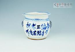 關(guān)明成的收藏中有幾個明清瓷壇,上有“狀元及第”、“五子登科”、“孝友為先”等文字,是那個時代提倡的道德規(guī)范,可謂口號陶瓷的濫觴。