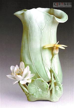 捏雕陶瓷是用手工將柔軟的泥料捏塑成各種形象,然后粘于器皿適當(dāng)部位的一種裝飾技法,帶有極強(qiáng)的手捏痕跡,達(dá)到自然美和人工技巧美高度融合。捏雕的作品以自然事物為題材,一般用比喻和象征手法突出主題,表現(xiàn)人們對(duì)美好事物的追求和寄托人們良好的祝福、愿望等。這件荷葉蜻蜓捏雕花插為中國(guó)工藝美術(shù)大師楊蘇明所創(chuàng)作,高32厘米。作品取材于蓮花塘小景,從卷體荷葉中獲得創(chuàng)作靈感,從現(xiàn)代陶藝泥板成型中得到啟發(fā),別出心裁地卷起一片直立的荷葉。荷苞上立著一只蜻蜓,翅膀薄如蟬翼,精巧細(xì)膩,動(dòng)靜結(jié)合,非常生動(dòng)。鮮綠滴翠的荷葉襯托了潔白的荷花,花瓣每片都制作得那么精美,巧奪天工。這件作品贊美了荷花“清凈本因心”的高潔品格,帶來(lái)了夏日清涼氣息,充滿詩(shī)情畫(huà)意。作者以嫻熟的技藝,借助于色釉、色泥等陶瓷材質(zhì),捏塑出荷塘清趣,給人一種賞心悅目的美的享受。
