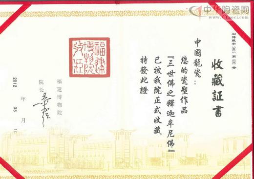 該作品榮獲2011中國(guó)(北京)禮品交易會(huì)暨國(guó)務(wù)政務(wù)禮品、大師精品展評(píng)比“銀獎(jiǎng)”及首屆“大地獎(jiǎng)”陶瓷作品評(píng)比“銅獎(jiǎng)”,日前被福建省博物院永久收藏。