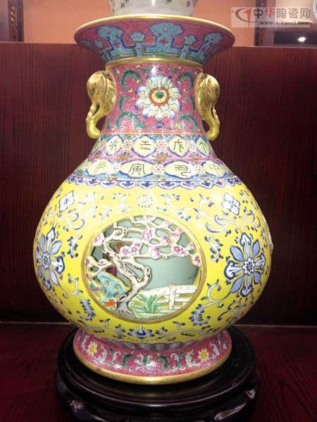 仿清乾隆粉彩鏤空開光花卉紋象耳轉(zhuǎn)心瓶