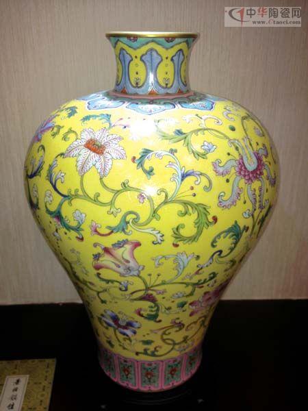 仿清乾隆黃地粉彩軋道花卉紋梅瓶