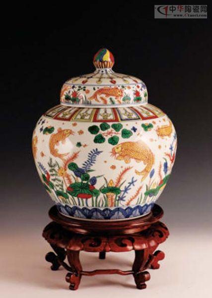 嘉靖五彩魚藻紋蓋罐,1955年出土于北京東郊,為明代的陳設(shè)品,現(xiàn)收藏于中國國家博物館。