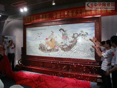 在開幕式舉行之前,已有眾多的觀眾早早來到現(xiàn)場,親睹大師的作品。走進(jìn)展廳,可以看到有三塊巨型瓷板仍被紅綢布遮擋,顯得格外神秘,這三件作品分別是中國工藝美術(shù)大師王隆夫2010年創(chuàng)作的4.1米X1.7米的青花瓷板《八百千秋》,2012年剛剛完成的4米X1.68米粉彩瓷板《南極星麻姑仙同往瑤池赴壽宴》,及中國工藝美術(shù)大師張育賢3.8米X1.58米的粉彩瓷板《神州珍寶》。《八百千秋》是王隆夫繪畫的景德鎮(zhèn)2010年世界最大青花瓷板,《南極星麻姑仙同往瑤池赴壽宴》是目前世界上最大的粉彩瓷板,《神州珍寶》則是王育賢耗費(fèi)多年時(shí)間完成的珍品。當(dāng)《南極星麻姑仙同往瑤池赴壽宴》被揭幕贏得全場贊嘆時(shí),本次活動的策劃人胡暉向觀眾介紹,以前,在景德鎮(zhèn)繪畫80X80厘米的瓷板都是要向有關(guān)方面上報(bào)的,如今這三件巨型瓷板能夠問世,也是大師花費(fèi)大量精力完成,實(shí)屬難得。