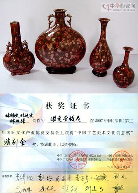 鐵銹紅釉、葵花天目釉、金銀圈、金錢花釉、玫瑰、三色環(huán)等高貴典雅、別具一格的新品,贏得了陶瓷美術(shù)界專家的高度評(píng)價(jià),為大眾所青睞。其中“耀變天目金銀圈”于2005年第二屆中國陶瓷產(chǎn)品設(shè)計(jì)競(jìng)賽榮獲金獎(jiǎng);葵花天目釉榮獲廣東省2006年陶瓷藝術(shù)創(chuàng)新設(shè)計(jì)大賽金獎(jiǎng)、并在第三屆中國(深圳)國際文化博覽交易會(huì)中榮獲中國工藝美術(shù)文化創(chuàng)意獎(jiǎng)特別金獎(jiǎng);《天目鐵銹紅釉20寸八寶瓶》和《耀變天目金銀圈瓶》收藏于中國北京中南海北區(qū)及國務(wù)院辦公廳;紅色耀變天目陶瓷制造方法及其使用的陶瓷釉已被國家知識(shí)產(chǎn)權(quán)局授予發(fā)明專利權(quán)。