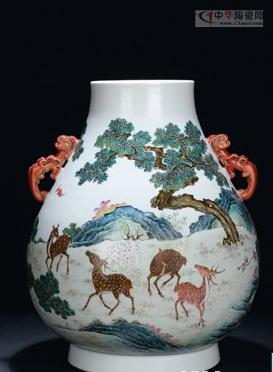 在明清瓷器專題中,“清乾隆 粉彩螭龍耳福祿尊”(高44.5cm)備受矚目。此件拍品曾于北京翰海以過千萬元的價(jià)格成交。器形雍容大氣,圓口,器形以下漸廣,垂腹,圈足,肩部飾雙螭龍耳,胎體厚重,釉面潔凈,造型端莊。腹部滿繪粉彩福祿圖,五色神鹿形態(tài)各異,且此風(fēng)格粉彩十鹿較之傳統(tǒng)畫面百鹿尊的流傳廖若星辰,傳是甚為稀少。最終,在幾番競(jìng)價(jià)之后,該福祿尊最終以2875萬元的價(jià)格成交,同時(shí)也成為該專場(chǎng)拍賣成交價(jià)格最高的拍品。