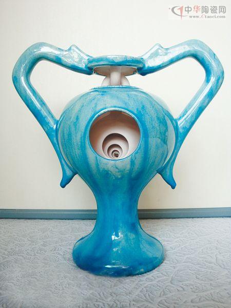 這個(gè)陶瓷作品叫《云龍瓶》,是我市民間工藝美術(shù)家孫震創(chuàng)作的!对讫埰俊芳蛐蔚豕芄に嚺c三彩工藝于一體,由外部瓶體和吊掛在瓶體內(nèi)部的4層球形吊管組成,且層層吊管由陶環(huán)相掛,可自由擺動(dòng)。瓶體上方有龍形雙耳,作品通體施青釉,燒制后呈青云色,故稱云龍瓶。
