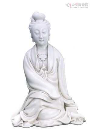 天津博物館藏有一件何朝宗款的白釉觀音,高20.9厘米、底寬15厘米。此尊塑像通體白釉,觀音舒坐,發(fā)髻高聳,眼簾下垂,身著羊腸裙,左臂下垂手扶一卷經(jīng),右手置于左膝上,雙膝交叉,呈交腿坐態(tài),蹺足。神態(tài)肅穆,衣紋簡練灑脫,由于雕塑技藝嫻熟,線條洗練,深刻表現(xiàn)了觀音超凡脫俗的神態(tài)。塑像背面有一陰文葫蘆形“何朝宗”款。此尊觀音應(yīng)為何朝宗的代表作。堅細(xì)的胎質(zhì)配以瑩潤的白釉,觀音愈發(fā)顯得如脂似玉、典雅可愛,令人嘆為觀止。