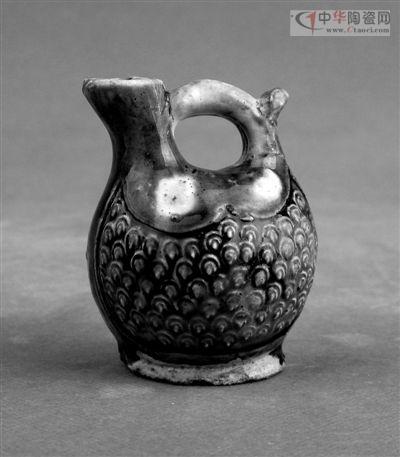 《唐代印花三彩扁壺》 深圳望野博物館藏這件三彩器,扁壺形,腹部有魚鱗狀印花,黃釉覆蓋,周邊有綠釉。釉色鮮艷,造型俊美,是有異域胡風(fēng)的器具。