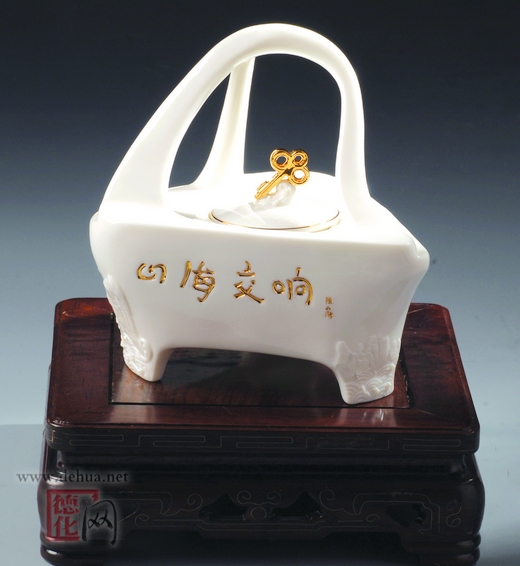 在中國(guó)的傳統(tǒng)文化元素當(dāng)中,龍的意象是不可或缺的,陳仁海的這些新作無(wú)疑也幾乎充分運(yùn)用到了這一意象!逗蜐伤暮!贰妒啦〾亍返榷紝⒐糯埖囊庀筮M(jìn)行繼承又創(chuàng)新的使用。以《和澤四!窞槔瑝刈旌蛪匕讯际且粭l螭龍形象,壺嘴處的螭龍攀附在壺身上,返身、昂首、張嘴,潔白如玉的出水口就蜿蜒從金色的龍嘴當(dāng)中伸出;壺把處的螭龍則仿佛從云端飛出,尾在上,頭在下,首尾緊貼在壺身,一條躬身彎曲的龍便栩栩如生、巧妙別致。