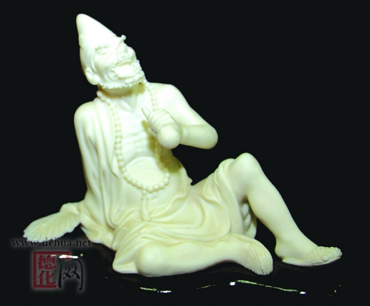 《濟(jì)公》是著名陶瓷工藝美術(shù)師許金盾(1937-1999)的遺作。許金盾少年從父許光寶學(xué)藝,1956年進(jìn)德化瓷廠師從雕塑名家蘇勤明,1958年又被選送福建省工藝美術(shù)學(xué)校進(jìn)修,,學(xué)成后有件瓷雕作品獲國家獎(jiǎng)。許金盾的濟(jì)公,斜坐于西湖邊,左手持破扇于地,袒膊的右手握住酒壺嘴,那看破凡塵的仰天大笑幽默詼諧,富有情趣,作品形象生動(dòng),線條有韻律感,工藝精巧,足見其雕塑功底之深厚。