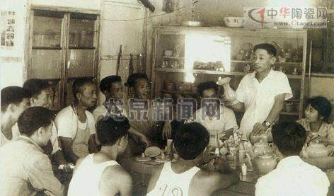 照片攝于上世紀(jì)六十年代,穿白襯衫的男子為原龍泉國(guó)營(yíng)瓷廠技術(shù)科長(zhǎng)賴自強(qiáng),正在向廠里的領(lǐng)導(dǎo)和技術(shù)人員傳授青瓷燒制工藝。當(dāng)年的聽眾,如今已經(jīng)有不少人成為聲名顯赫的青瓷大師。