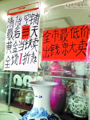 濱江東路一家景德鎮(zhèn)瓷器展銷會(huì)打出清貨甩賣廣告。