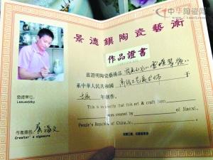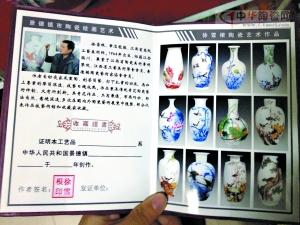 在濱江東路一家景德鎮(zhèn)瓷器展銷會(huì)店鋪,只見(jiàn)一個(gè)青瓷花瓶旁放著一份封皮皺皺巴巴的“收藏證書”。記者發(fā)現(xiàn),這些證書印刷粗糙,多為相紙打印。證書左側(cè)一般印著“名家”簡(jiǎn)介,右側(cè)則是一幅或多幅瓷器作品的照片。記者在網(wǎng)上搜索,發(fā)現(xiàn)一些作品確實(shí)能與這些名家的作品相對(duì)應(yīng),但卻無(wú)法辨別真?zhèn)巍?/p>