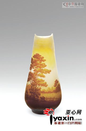 一只黃色玻璃瓶,肚大口小,瓶身上,一片空曠的草地,綠樹成蔭,婆娑起舞,散發(fā)著詩一般的浪漫氣息,這就是法國加萊白地風景套料瓶。