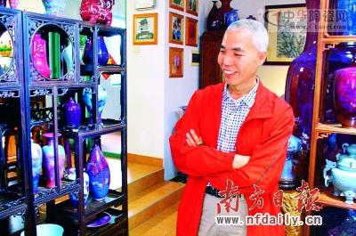 家住古鎮(zhèn)鎮(zhèn)的區(qū)均煥是中山市收藏家協(xié)會的副會長,涉足收藏已有近20年,如今經(jīng)營著一家藝術(shù)品公司,在中山的收藏界也頗有名氣。在鑒寶類節(jié)目大行其道的當(dāng)下,初入行的大部分收藏者紛紛沉溺于到古玩市場“淘寶”、鑒賞古董,不少人仍寄望于碰運(yùn)氣找到一件從遠(yuǎn)古流傳至今的寶貝,區(qū)均煥則專注于近代鈞瓷藝術(shù)品和寶玉石精品的收藏。
