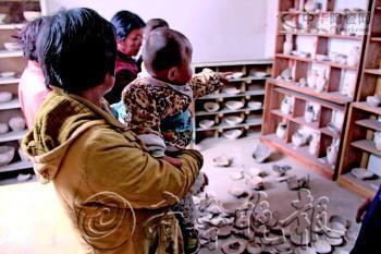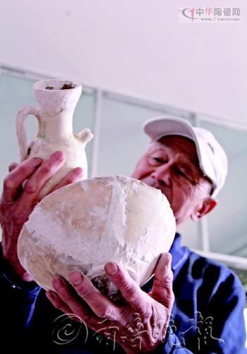 徐安振在查看使用宋代古瓷粘拼的瓷碗、古瓷罐。