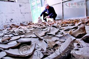 徐安振老人在整理陶器碎片。