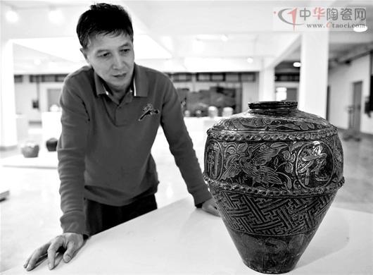 在展廳中,一件做工細(xì)致、花紋精美的八仙人物壇,吸引了參觀者的注意。余長(zhǎng)庭介紹說(shuō),這是一件清代早期的陶器,本是一個(gè)裝酒的罐子,他在多年前花4500元買了回來(lái)。但這件馬口窯陶器的價(jià)值,遠(yuǎn)不能以金錢來(lái)衡量。