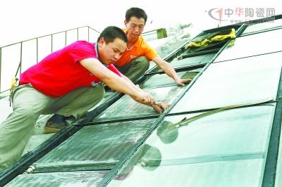 華泰集團員工在屋頂安裝陶瓷太陽板。
