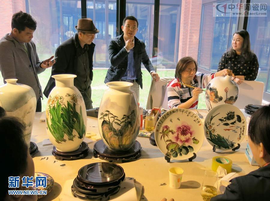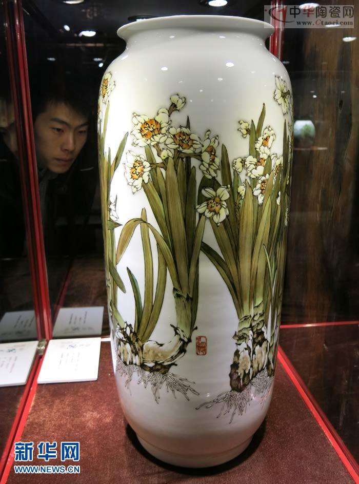 來賓在觀看中國陶瓷藝術(shù)大師涂翼報(bào)創(chuàng)作的水仙題材作品。
