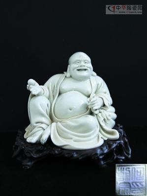 德化瓷雕的題材除動(dòng)植物形象外,更多是獨(dú)立的人物造型,其中以佛道人物題材居多。這些瓷雕背部往往有“何朝宗”“林朝景”等瓷雕匠師的印款,其中以何朝宗的最為著名。此件彌勒佛現(xiàn)藏于蘇州古玩城的德存軒,即為何朝宗之作,其胎骨堅(jiān)細(xì)潔白,形體厚重,釉色溫潤如玉。彌勒佛雙耳垂肩,盤膝曲腿,席地而坐,袈裟夸大,衣帶飄逸,大有曹衣出水、吳帶當(dāng)風(fēng)的韻律。其袒胸露腹,笑意滿面,雙眼炯炯有神,姿態(tài)生動(dòng)自然,雕刻手法細(xì)膩,線條圓潤,惟妙惟肖,極富神韻,背后隱約可見“何朝宗印”款。