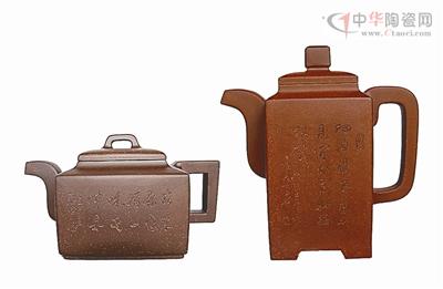觀她創(chuàng)作的《高矮四方對壺》,無論造型、書畫,堪稱鴻篇巨制,定是匯集靈感,精密構(gòu)思,潛心雕琢,方能畢現(xiàn)這一對紫砂壺的完美氣質(zhì)和剛毅品格。高壺壺體呈長方形,棱線明朗,四足于壺身處抽出,高聳挺拔,大氣穩(wěn)健。壺蓋微鼓,如一枚玉璽,端莊華貴,擺脫了硬朗單調(diào)的方壺特色。大圈把、大彎流配合整個(gè)壺身,更顯方正大氣。而矮方壺的壺體呈正方形,壺蓋亦微鼓,線條略顯圓潤,橋形鈕,突兀有力,壺把方正,壺流彎曲,相得益彰,充實(shí)且完善了整體的視覺效果。