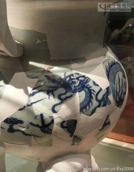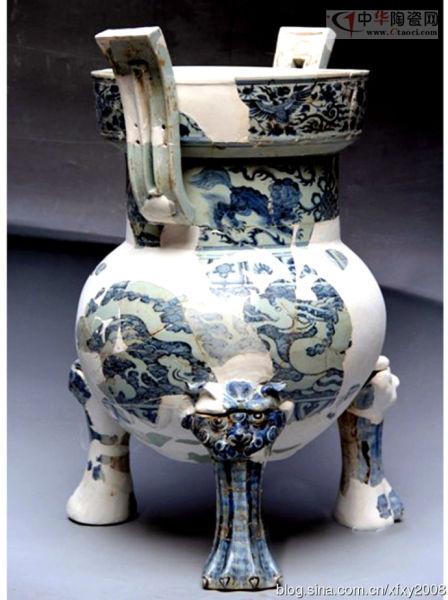 2013年4月16日上午,鎮(zhèn)江市文廣新局召開2013年第二季度重點(diǎn)工作新聞發(fā)布會(huì),介紹了京口閘遺址發(fā)現(xiàn)至今,發(fā)現(xiàn)了多個(gè)古代遺跡。其中,一對(duì)元代青花海水龍紋香爐尤為珍貴?梢哉f是自景德鎮(zhèn)窯址區(qū)發(fā)現(xiàn)同類香爐標(biāo)本之后,其他地區(qū)至今發(fā)現(xiàn)的唯一一對(duì)特殊造型的元青花瓷器。此鼎元代青花海水龍紋香爐造型別致,器形碩大,整體造型夸張而不失大氣。頸部設(shè)有一副對(duì)稱長(zhǎng)方形孔的“S”形方耳,耳部外側(cè)下半部分別帶有特殊輔首,主體分段印坯接胎成型,勁部外繪鳳紋穿枝牡丹,外腹中部飾海水龍紋,下部設(shè)獸頭三足,通高65.5、口徑34.5、底徑18厘米。整體給人一種氣勢(shì)磅礴之感,足顯元代王朝的非法之氣。