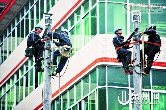 昨日清晨,電力工作人員已開始施工。兩根12.5米高電線桿上,六名施工人員穿著“腳扣”在緊張施工。德化有1000多家陶瓷企業(yè),幾乎都用上電窯爐,而安裝公用配電變壓器,是為服務(wù)小型陶瓷企業(yè)。