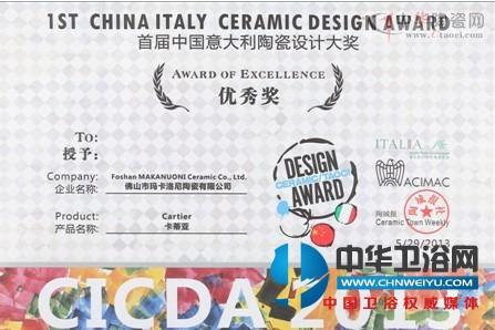 5月29日晚,由意大利對(duì)外貿(mào)易委員會(huì)及意大利陶瓷機(jī)械及設(shè)備制作協(xié)會(huì),聯(lián)合中國(guó)陶瓷行業(yè)權(quán)威媒體陶城報(bào),共同舉辦的首屆中國(guó)意大利陶瓷設(shè)計(jì)大賽頒獎(jiǎng)禮,在佛山新媒體產(chǎn)業(yè)園隆重舉行。瑪卡洛尼瓷磚“卡蒂亞”系列,憑借高超的工藝技術(shù),采用仿自然石頭斷面的紋理效果,濃厚的自然氣息受到評(píng)委團(tuán)的一致好評(píng),授予首屆中國(guó)意大利陶瓷設(shè)計(jì)大獎(jiǎng)優(yōu)秀獎(jiǎng)。