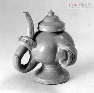 ■五代甌窯青釉瓜形帶蓋曲流壺。
