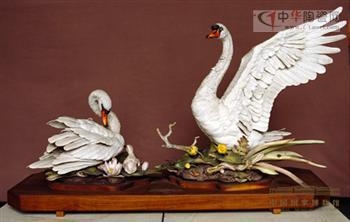 這件藝術(shù)品是由美國新澤西州波姆陶瓷藝術(shù)中心燒制。該中心的創(chuàng)始人愛德華?馬歇爾?波姆,是美國著名生物學家和鳴禽硬瓷燒制大師。他畢生踏遍歐美著名山林,悉心觀察鳥類的棲息動態(tài)和習性,創(chuàng)作了大量飛禽藝術(shù)作品。瓷塑天鵝是其晚年的杰作之一。作者成功地把天鵝繁衍、哺育和愛撫后代的生態(tài)本能,塑造得維妙維肖。作品大小天鵝、水草、魚蟲,無不栩栩如生,盎然成趣,是一件塑、雕、色結(jié)合得十分縝密、和諧的藝術(shù)品。