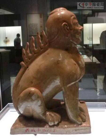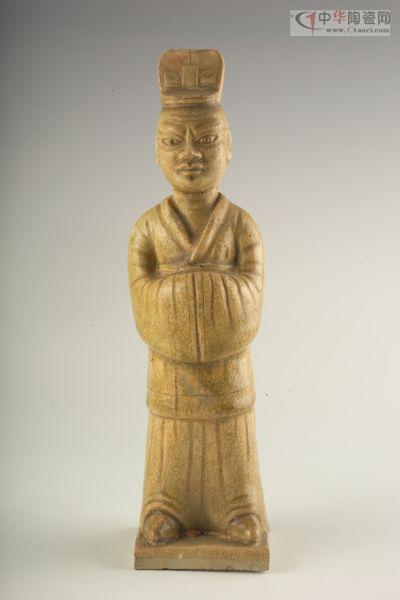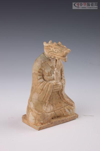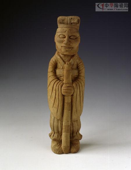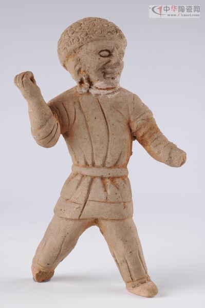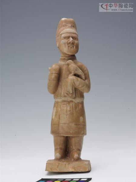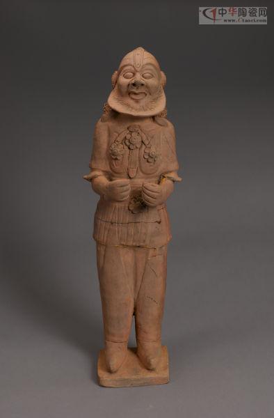 1972年出土于湘陰縣城南公社隋大業(yè)六年墓葬中,是一件不可多得的有準確紀年的隋代胡俑。該俑為陶質(zhì),高27厘米,濃眉大眼,高鼻,絡(luò)腮胡須,綰發(fā)小冠,上身著寬袖開襟衣服,胸前系帶,下穿百褶褲,褲筒碩大,系有繩帶,雙手持杖立于身前,腳穿草鞋。